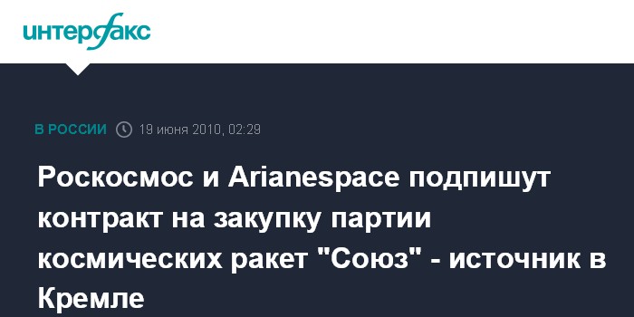 Санкт-Петербург. 19 июня. ИНТЕРФАКС-АВН - Роскосмос и французская компания Arianespace подпишут в субботу в Петербурге контракт на закупку дополнительной партии ракет-носителей "Союз", сообщил источник в Кремле.