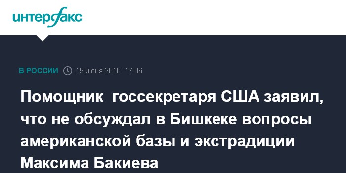 Москва. 19 июня. INTERFAX.RU – Помощник госсекретаря США Роберт Блэйк заявил, что в ходе встреч с руководством временного киргизского правительства вопрос о пребывании в Киргизии американского центра транзитных перевозок в аэропорту Манас не обсуждался. Также, по его словам, не обсуждался вопрос о взаимосвязи дальнейшего пребывания этой американской военной базы в Киргизии с требованием властей республики экстрадировать в Бишкек сына экс-президента Киргизии Максима Бакиева, который добивается получения убежища в Великобритании.