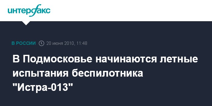 Москва. 20 июня. INTERFAX.RU - Летные испытания беспилотного летательного аппарата комплекса воздушной разведки "Истра-013" разработки Истринского экспериментального электромеханического завода (ИЭМЗ) начнутся в ближайшее время, сообщил "Интерфаксу-АВН" директор ИЭМЗ Юрий Бажанов. "Беспилотник" разработан и изготовлен по заказу одной из силовых структур. Сейчас идет его отладка. Летом начнутся летные испытания. Их завершение можно ожидать в четвертом квартале", - сообщил Ю.Бажанов.