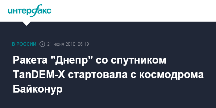 Москва. 21 июня. ИНТЕРФАКС-АВН - Пуск российско-украинской ракеты РС-20Б (коммерческое название "Днепр") с германским радиолокационным космическим аппаратом TanDEM-X выполнен с космодрома Байконур в Казахстане.
