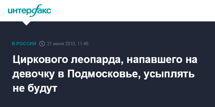 Ранее сообщалось, что леопард во время циркового представления напал на 7-летнюю артистку цирка-шапито в подмосковном Клину. Инцидент произошел в воскресенье около 13:00. Дрессировщик выводил леопарда на сцену для представления. В этот момент к нему подбежала его дочь. Леопард мгновенно вцепился ребенку в горло. Ребенок получил рваную рану шеи и был срочно госпитализирован.