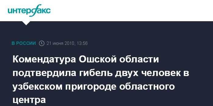 Москва. 21 июня. INTERFAX.RU - Комендатура Ошской области Киргизии заявила, что в результате "зачистки" в населенном узбеками пригороде областного центра погибли два человека. По словам представителя пресс-службы комендатуры, при самой "зачистке" погиб один человек, еще один скончался по дороге в больницу.