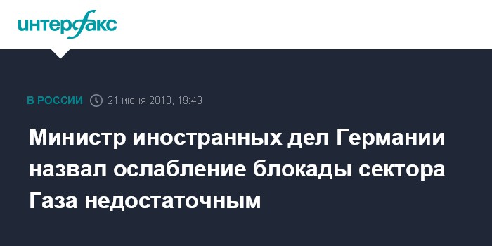 Москва. 21 июня. INTERFAX.RU - Министр иностранных дел Германии Гвидо Вестервелле считает облегчение израильской блокады сектора Газа недостаточной мерой, сообщает в понедельник интернет-сайт немецкой газеты "Цайт".