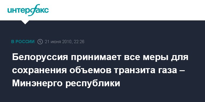 Минск. 21 июня. ИНТЕРФАКС-ЗАПАД - Представитель Минска заявил о намерении властей Белоруссии не допустить сокращения транзита газа из-за ограничений на газовые поставки в республику со стороны российского "Газпрома".