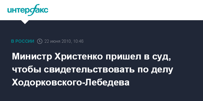 Москва. 22 июня. INTERFAX.RU - Глава Минпромторга Виктор Христенко прибыл во вторник в Хамовнический суд Москвы, чтобы дать свидетельские показания по второму уголовному делу в отношении экс-главы НК "ЮКОС" Михаила Ходорковского и бывшего руководителя МФО "МЕНАТЕП" Платона Лебедева, передает корреспондент "Интерфакса". Освещать выступление Христенко собралось меньше журналистов, чем накануне, когда в суде был председатель правления Сбербанка Герман Греф.
