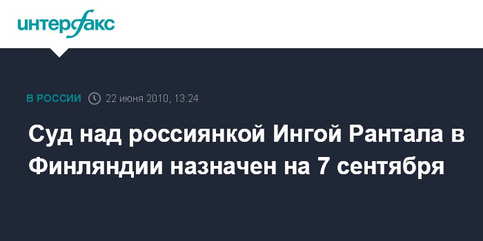 Москва. 22 июня. INTERFAX.RU - Суд над проживающей в Финляндии в городе Турку россиянкой Ингой Рантала по обвинению в избиении сына Роберта намечен на 7 сентября. Как сообщила во вторник "Интерфаксу" Рантала, первоначально планировалось провести судебное заседание 17 июня, но затем было принято решение перенести его на 7 сентября.