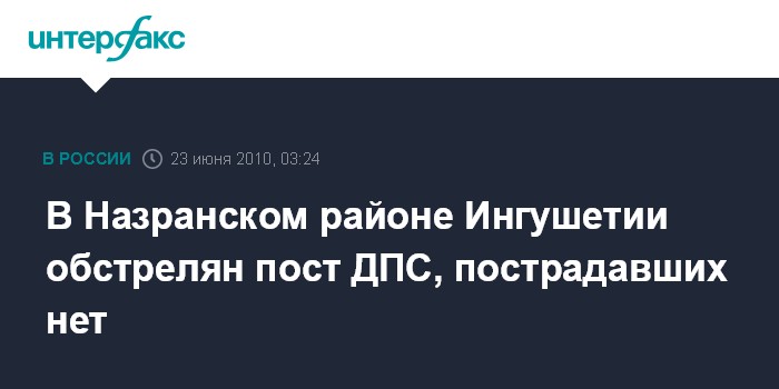Ростов-на-Дону. 23 июня. ИНТЕРФАКС-ЮГ – В Назранском районе Ингушетии в ночь на среду из подствольного гранатомета неизвестными был обстрелян пост ДПС, сообщили в среду агентству «Интерфакс-Юг» в местном РОВД.