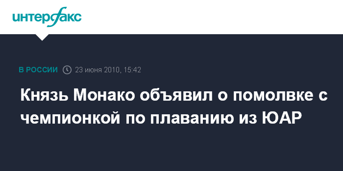 Москва. 23 июня. INTERFAX.RU - Князь Монако Альбер II сообщил в среду о помолвке с бывшей чемпионкой по плаванию из ЮАР Шарлен Уиттсток, передает агентство ЭФЭ. Дата и место предстоящей свадьбы 52-летнего князя с 32-летней бывшей спортсменкой пока не называются, отмечается в сообщении.