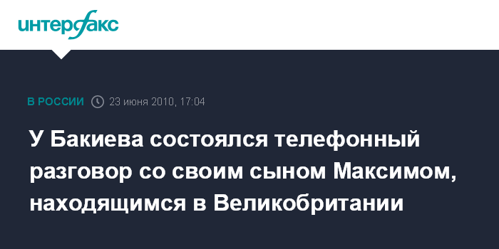 Москва. 23 июня. INTERFAX.RU – Курманбек Бакиев сообщил о телефонном разговоре со своим сыном Максимом и не назвал, в целях безопасности, местонахождение своих остальных родственников.