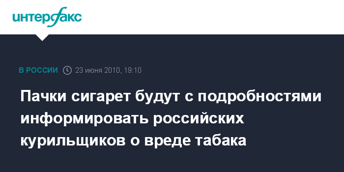 Москва. 23 июня. INTERFAX.RU - Надписи о вреде курения на пачках сигарет в ближайшее время станут больше по размеру и разнообразнее - среди прочего они будут предупреждать о риске развития импотенции и бесплодия, сообщает Минздравсоцразвития. "В России вступили в силу нормы, предусмотренные Федеральным закон от 22 декабря 2008 г. "Технический регламент на табачную продукцию". В соответствии с ним, изменяется формат и содержание предупреждающих надписей на табачной продукции", - говорится в пресс-релизе ведомства, распространенном в среду.