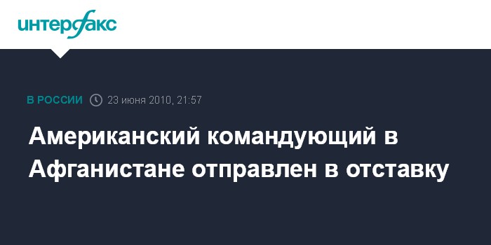 Москва. 23 июня. INTERFAX.RU - Президент США Барак Обама снял с должности командующего объединенными силами НАТО в Афганистане генерала Стенли Макристала, оказавшегося в центре громкого скандала из-за своих резких высказываний в адрес американской администрации. Новым командующим в Афганистане стал Дэвид Петреус, возглавлявший коалиционные силы в Ираке, сообщила в среду телекомпания CNN.