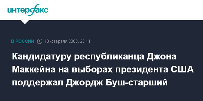 Вашингтон. 18 февраля. INTERFAX.RU - Бывший президент США Джордж Буш-старший в понедельник заявил о поддержке республиканского кандидата на пост нового президента США Джона Маккейна.