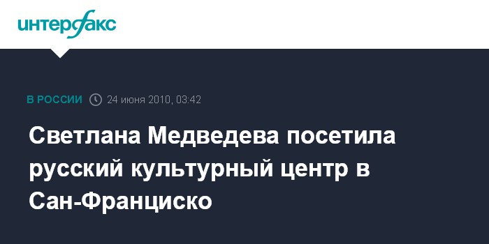 Сан-Франциско. 24 июня. ИНТЕРФАКС - Супруга президента России Светлана Медведева посетила русский культурный центр в Сан-Франциско (США) и редакцию газеты "Русская жизнь".