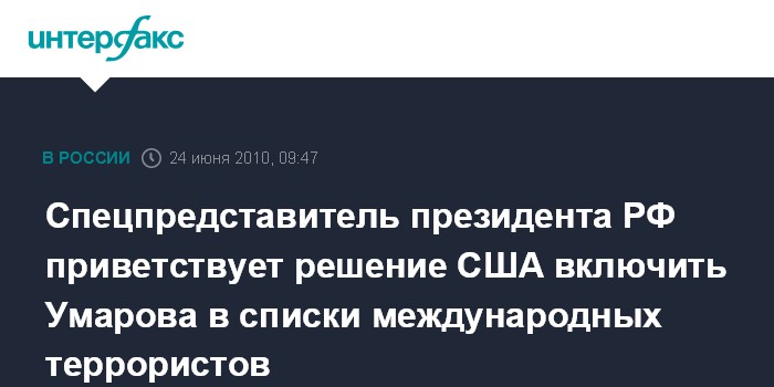 Москва. 24 июня. INTERFAX.RU - Решение США включить лидера чеченских боевиков Доку Умарова в перечень международных террористов поможет российским усилиям в сфере антитеррора на Северном Кавказе, заявил "Интерфаксу" в четверг спецпредставитель президента РФ по вопросам международного сотрудничества в сфере борьбы с транснациональной преступностью и терроризмом Анатолий Сафонов. "Речь идет о конкретной фигуре. Умарову повешен ценник "преступник" со всеми вытекающими последствиями. Это и мандат на международный розыск, и ордер на международные финансовые, оперативные и юридические санкции", - сказал Сафонов. "Это пример практического сотрудничества России и США в сфере антитеррора. Это, безусловно, плюс", - сказал он о внесении Умарова в американские "черные списки".