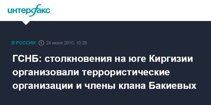 Москва. 24 июня. INTERFAX.RU - В организации массовых беспорядков на юге Киргизии участвовали международные террористические организации, действующие совместно с семьей бывшего президента Курманбека Бакиева, заявил журналистам в четверг глава Государственной службы национальной безопасности республики Кенешбек Душебаев. "В результате проведенных оперативных мероприятий государственной службой нацбезопасности Киргизии установлен круг деструктивных сил, непосредственно причастных к развязыванию трагедии на территории Ошской и Джалал-Абадской областей. Это международные террористические организации "Исламское движение Узбекистана", "Союз исламского джихада" при активном участии членов семейно-кланового режима Бакиевых", - сказал Душебаев. Он отметил, что основным финансистом беспорядков выступал младший сын экс-президента Максим Бакиев, который был готов выделить на эти цели $30 миллиона.