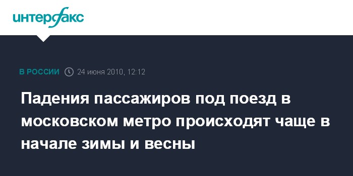 Москва. 24 июня. INTERFAX.RU - Случаи падения пассажиров под поезда столичного метрополитена чаще всего фиксируются в начале зимы и в начале весны, сообщил "Интерфаксу" главный диспетчер московского метро Александр Яковлев в четверг. "По статистике это так, но трудно сказать, почему именно в эти периоды", - сказал он.