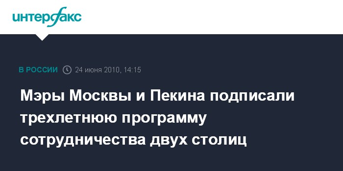 Москва. 24 июня. INTERFAX.RU – Программу сотрудничества между правительством Москвы и народным правительством Пекина на 2010-2012 годы подписали в четверг мэр Москвы Юрий Лужков и мэр Пекина Го Цзиньлун во время встречи в российской столице.