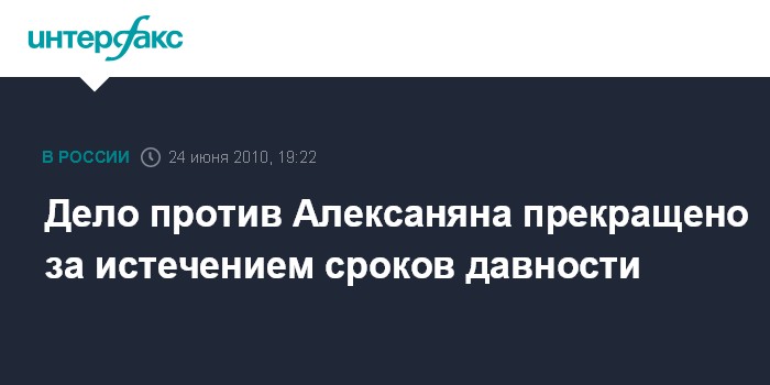 Как передает корреспондент "Интерфакса", таким образом, было удовлетворено соответствующее ходатайство защиты подсудимого. Адвокат В.Алексаняна просил прекратить дело за истечением сроков давности по инкриминируемым его клиенту преступлениям.