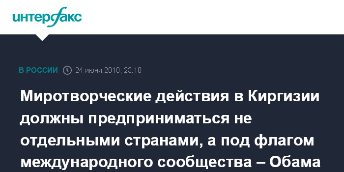 "Все действия, которые предпринимаются по защите гражданского населения (Киргизии - ИФ), должны предприниматься не под флагом какой-то одной страны, а под флагом мирового сообщества. Поэтому наши правительства будут продолжать мониторинг за этой ситуацией", - сказал он в Вашингтоне в четверг на совместной пресс-конференции с президентом РФ Дмитрием Медведевым, показанной в эфире телеканала "Россия-24".