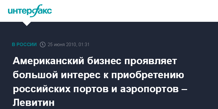 "У американских инвесторов очень большой интерес к приобретению российских портов и аэропортов в связи с внесенными изменениями в перечень российских стратегических предприятий (из которого ряд морских и воздушных портов теперь исключены)", - сказал И.Левитин, отвечая на вопрос "Интерфакса".