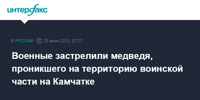 Петропавловск-Камчатский. 25 июня. ИНТЕРФАКС-ДАЛЬНИЙ ВОСТОК- Медведь отстрелен караулом одной из воинских частей, расположенной около города Вилючинск в Камчатском крае.