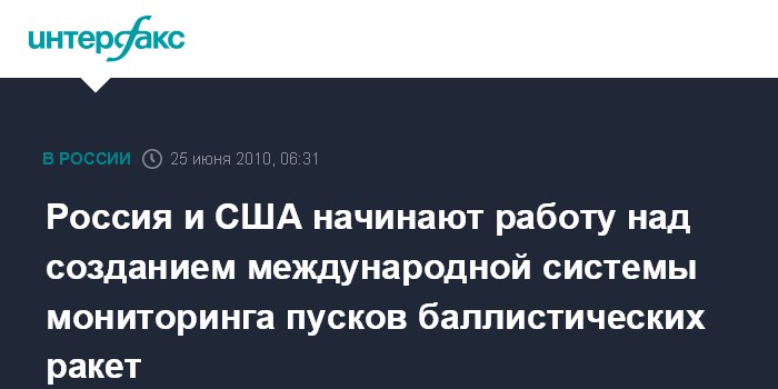 "Конечной целью такого сотрудничества стало бы создание международной системы мониторинга пусков баллистических ракет и космических ракет-носителей, а также обмена данными о них. Российские и американские эксперты встретятся в ближайшее время, чтобы начать этот процесс", - говорится в заявлении Д.Медведева и Б.Обамы, текст которого размещен на сайте Кремля.