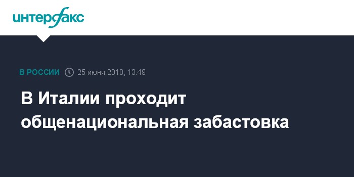 Москва. 25 июня. INTERFAX.RU - Всеобщая забастовка проводится в пятницу в Италии в знак протеста против бюджетной политики правительства страны, сообщает газета "Репубблика". Акция протеста организована одним из крупнейших местных профсоюзов - Всеобщей итальянской конфедерацией труда. Госслужащие в пятницу не будут работать в течение восьми часов, тогда как итальянцы, работающие в частном секторе, будут бастовать четыре часа.
