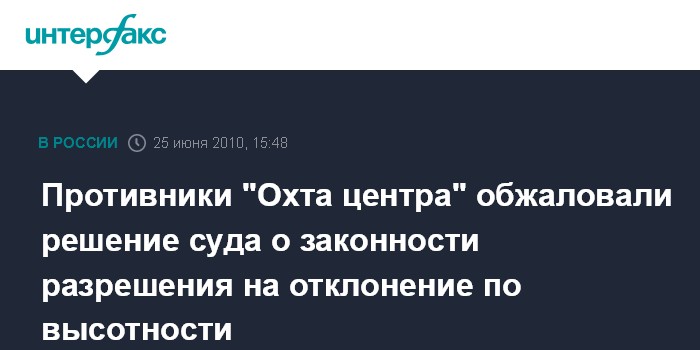 Москва. 25 июня. INTERFAX.RU - Противники строительства общественно-делового района "Охта центр" обжаловали недавнее решение Смольнинского районного суда, признавшего законным постановление правительства Петербурга о предоставлении разрешения на отклонение от предельных параметров по высоте при реализации проекта.