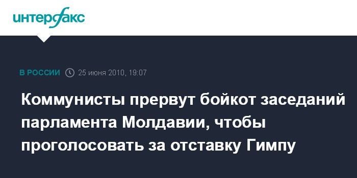 Коммунисты призывают коллег-депутатов из правящего Альянса за европейскую интеграцию поставить на голосование вопрос о немедленной отставке М.Гимпу с поста председателя парламента и, соответственно, главы государства. Коммунисты, которые на протяжении трех месяцев, бойкотируют заседания парламента, добиваясь досрочных парламентских выборов, заявили, что в понедельник, 28 июня придут в парламент, чтобы включить в повестку дня вопрос об отставке спикера и принять участие в голосовании.