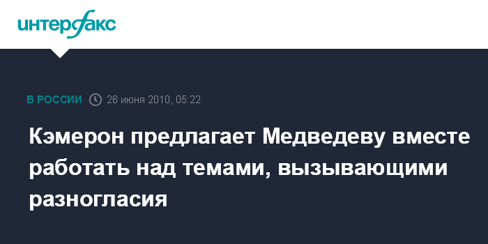"Мы готовы вместе работать с вами как по темам, в которых мы согласны, так и по вопросам, где у нас еще есть расхождения", - сказал Д.Кэмерон во время встречи с президентом России Дмитрием Медведевым.