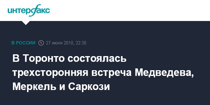 Торонто. 27 июня. ИНТЕРФАКС - Президент России Дмитрий Медведев принял в воскресенье участие на полях саммита "большой двадцатки" в трехсторонней встрече с президентом Франции Николя Саркози и канцлером Германии Ангелой Меркель.
