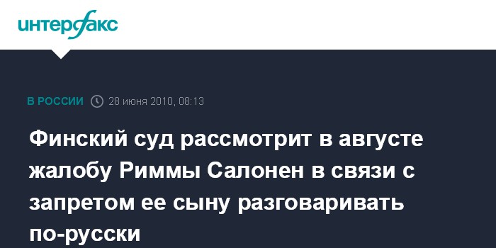 Москва. 27 июня. INTERFAX.RU – В Финляндии административный суд города Турку принял к рассмотрению жалобу россиянки Риммы Салонен в связи с запретом ее сыну, 7-летнему Антону, разговаривать на родном, русском языке.