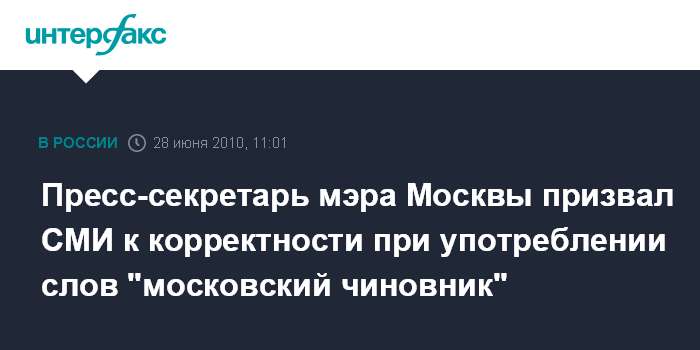 Москва. 27 июня. INTERFAX.RU – Пресс-секретарь мэра Москвы Сергей Цой призвал СМИ быть более корректными при употреблении слов "московский чиновник". Цой напомнил, что на днях "в прессе появились сообщения, что на юге Москвы сотрудниками ФСБ при получении взятки были арестованы московские чиновники".