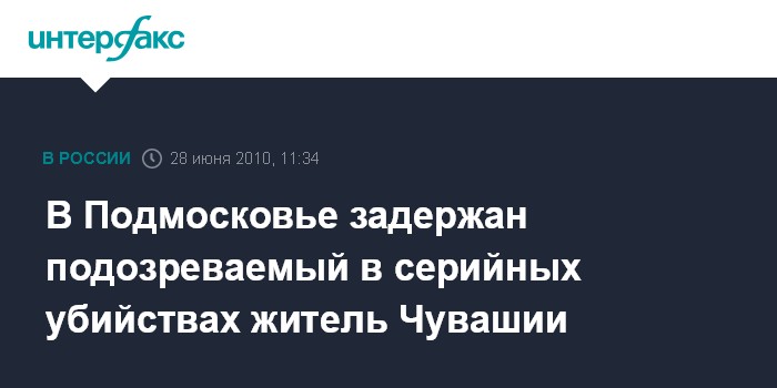 Москва. 27 июня. INTERFAX.RU – Оперативники Департамента уголовного розыска МВД России задержали в Подмосковье подозреваемого в серии жестоких убийств и изнасилований, совершенных на территории республики Чувашия в конец 90х-начале 2000-х г.г.