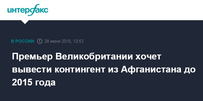 Лондон. 28 июня. INTERFAX.RU - Глава британского правительства Дэвид Кэмерон рассчитывает на вывод британского контингента из Афганистана в течение пяти лет.