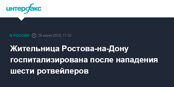 Москва. 28 июня. INTERFAX.RU - В Железнодорожном районе Ростова-на-Дону шесть ротвейлеров напали на 21-летнюю девушку. "Семейство ротвейлеров, включая четырех десятимесячных щенков, напали на дочь своей хозяйки, девушка госпитализирована", - сообщили агентству "Интерфакс-Юг" в понедельник в пресс-службе УВД Ростова-на-Дону.