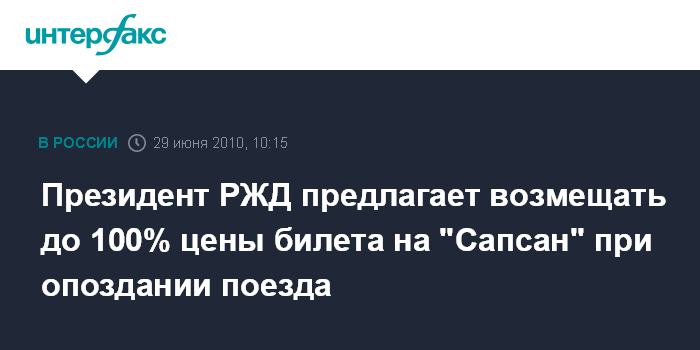 "Я дал поручение проработать вариант, при котором 30-минутная задержка "Сапсана" влечет за собой до 100% возмещения стоимости билета. Я не знаю, будут ли это 100%-ное возмещение, или это будет 50%-ное - это должно правление решить. Но моя позиция заключается в том, что мы отвечаем за тот сервис, который предлагаем", - заявил он во вторник журналистам в Москве. "Люди платят деньги за то, чтобы приезжать на скоростном поезде", - пояснил глава РЖД.