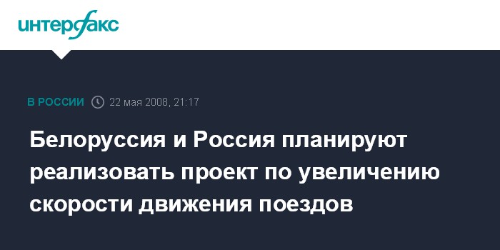 Минск. 22 мая. ИНТЕРФАКС-ЗАПАД - Транспортные ведомства Белоруссии и России планируют реализовать проект по увеличению скоростей движения железнодорожных поездов между странами, сообщил министр транспорта РФ Игорь Левитин журналистам в четверг в Минске.