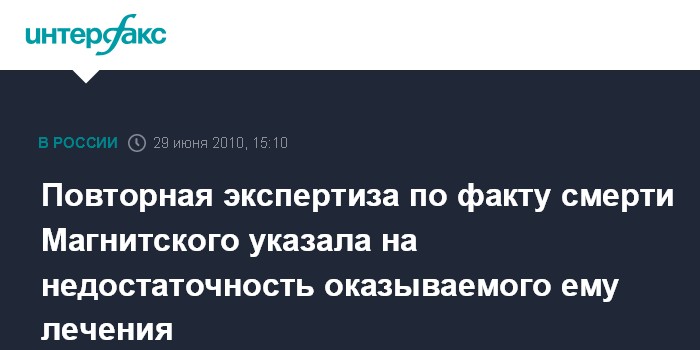 Москва. 29 июня. INTERFAX.RU - Повторная экспертиза причин смерти скончавшегося в СИЗО юриста фонда Hermitage Capital Сергея Магнитского подтвердила первоначальную причину его смерти - острая сердечная недостаточность. "Готова повторная экспертиза. Первоначальная причина смерти подтверждена", - сказала "Интерфаксу" во вторник адвокат Магнитского Елена Орешникова. Она напомнила, что это вторая экспертиза, которая проводится по факту смерти в московском СИЗО юриста, теперь к работе было привлечено большее количество специалистов, однако они изучали уже имеющиеся документы. "Сама экспертиза достаточно объемная, в ней отмечено, что надлежащей медицинской помощи С.Магнитскому не оказывалось - иногда ставились неправильные диагнозы, оказывалось неправильное лечение", - сказала адвокат.