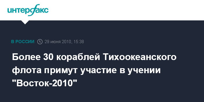 Москва. 29 июня. INTERFAX.RU - Тихоокеанский флот (ТОФ) принимает активное участие в оперативно-стратегическом учении "Восток-2010", которое началось во вторник, сообщает управление пресс-службы и информации Минобороны РФ. "К учениям привлекается свыше 30 боевых кораблей и судов обеспечения, около 20 самолетов и вертолетов морской авиации Тихоокеанского флота", - говорится в сообщении, поступившем в "Интерфакс-АВН" во вторник.