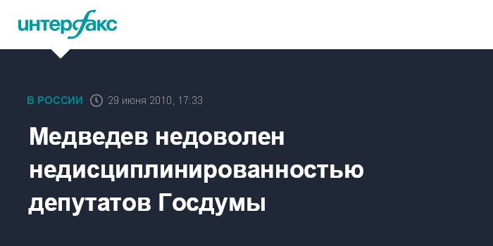 Москва. 29 июня. INTERFAX.RU – Президент РФ Дмитрий Медведев в своем "Твиттере" выразил недовольство тем, что некоторые народные избранники пропускают заседания Госдумы. "Депутаты должны следить за явкой на заседаниях парламента. Просто стыдно смотреть на пустые кресла. На работу надо ходить", - отметил он.