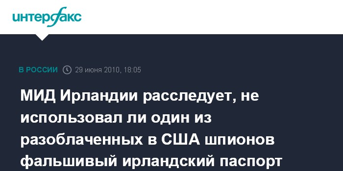 Лондон. 29 июня. INTERFAX.RU - Министерство иностранных дел Ирландии изучает сообщения о том, что один из возможных российских агентов, разоблаченных в США, мог использовать поддельный ирландский паспорт, сообщает в среду интернет-сайт ирландской газеты Irish Times.