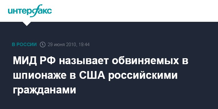 "В связи с обвинениями, выдвинутыми в США в отношении группы лиц по подозрению в разведдеятельности в пользу России, сообщаем, что речь идет о российских гражданах, в разное время оказавшихся на территории США. Они не совершали каких-либо действий, направленных против интересов США", - говорится в комментарии официального представителя МИД РФ, размещенном во вторник на сайте министерства.