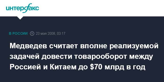 "Очевидно, что Россия и Китай являются очень крупными торговыми партнерами, и сальдо взаимной торговли с каждым годом у нас увеличивается. Те рубежи, которые мы наметили для себя, - выйти на торговый оборот, составляющий 60, впоследствии 70 млрд долларов по году, -я думаю, абсолютно достижимы", - сказал Д.Медведев в интервью китайским СМИ накануне визита в КНР.