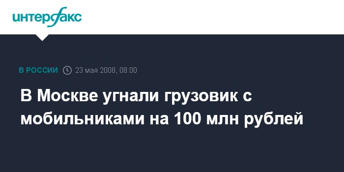 Москва. 23 мая. INTERFAX.RU - Сегодня рано утром в центре Москвы на ул. Большая Дорогомиловская неизвестные угнали фуру с сотовыми телефонами общей стоимостью 100 млн рублей.