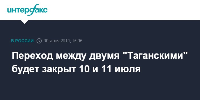 Москва. 30 июня. INTERFAX.RU – Переход между станциями "Таганская" Таганско-Краснопресненской и Кольцевой линий московского метрополитена будет закрыт 10 и 11 июля, сообщает администрация столичной подземки.