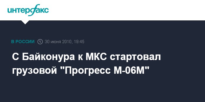 Москва. 30 июня. INTERFAX.RU - Российская ракета-носитель "Союз-У" с транспортным космическим кораблем "Прогресс М-06М" стартовала с космодрома Байконур.