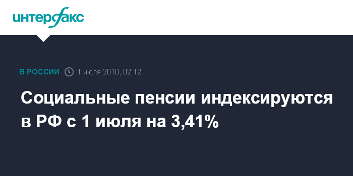 "С 1 июля социальные пенсии будут дополнительно увеличены на 3,41%. Общее увеличение социальных пенсий за 2010 год составит 12,51%, с учетом индексации, проведенной в апреле этого года", - сообщили в Минздравсоцразвития.
