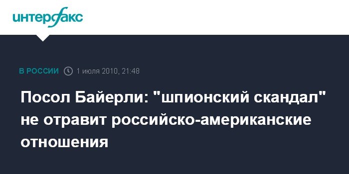 "Думаю, эту точку зрения разделяют и в России", - добавил глава американской дипмиссии. При этом он уклонился от подробного комментария на данную тему. "Этот вопрос относится к разведывательной и правоохранительной областям, поэтому я не могу дать детальный комментарий", - сказал Байерли.