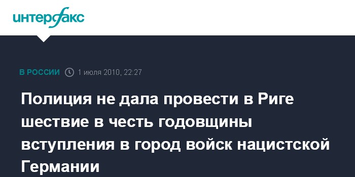 Рига. 1 июля. ИНТЕРФАКС/BNS - Сотрудники рижской полиции в четверг вечером не разрешили собравшимся около Музея оккупации начать шествие в честь 69-ой годовщины вступления в Ригу войск нацистской Германии из-за отсутствия организатора этого мероприятия, сообщает агентство BNS.